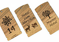 Wir können Ihre schönen, neuen Schlüsselanhänger wie graviertes Holz mit transparentem Schutz aussehen lassen (und so sehen sie dann noch lange aus).