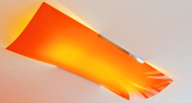 Weil die Schutzscheibe nur partiell eingespannt wird, entsteht eine ästhetische, sich nach oben öffnende Wölbung (die zeichnet unsere Deckenleuchten mit einer "Spannweite" von bis zu 3m aus).